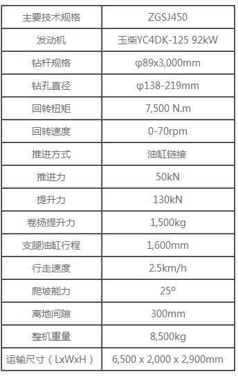 ·推进、提升配有快慢档,可以提高打孔效率,大扭矩回转头,回转速度有两档,并且转速可调,适用于不同孔径和地质状况。技术参数: